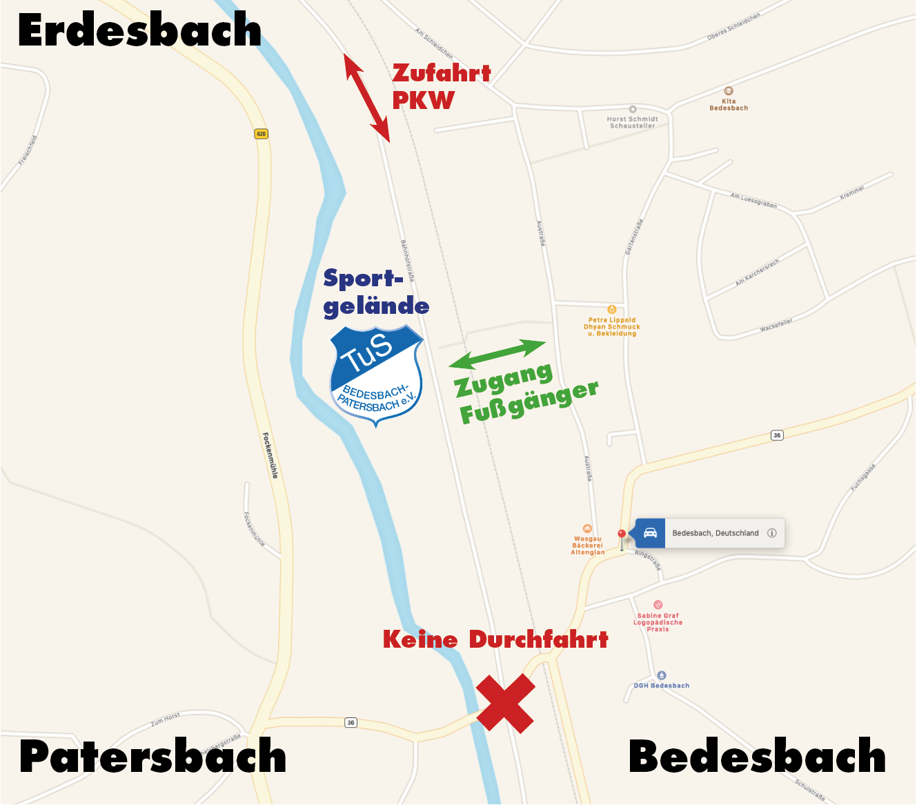 Wichtige Info an alle Fans des TuS: Die Zufahrt zum Sportgelände kann zur Zeit N U R über Erdesbach, an der Kläranlage vorbei erfolgen. Der Zugang zu Fuß kann über den Durchgang von der Austraße zum Sportgelände erfolgen.