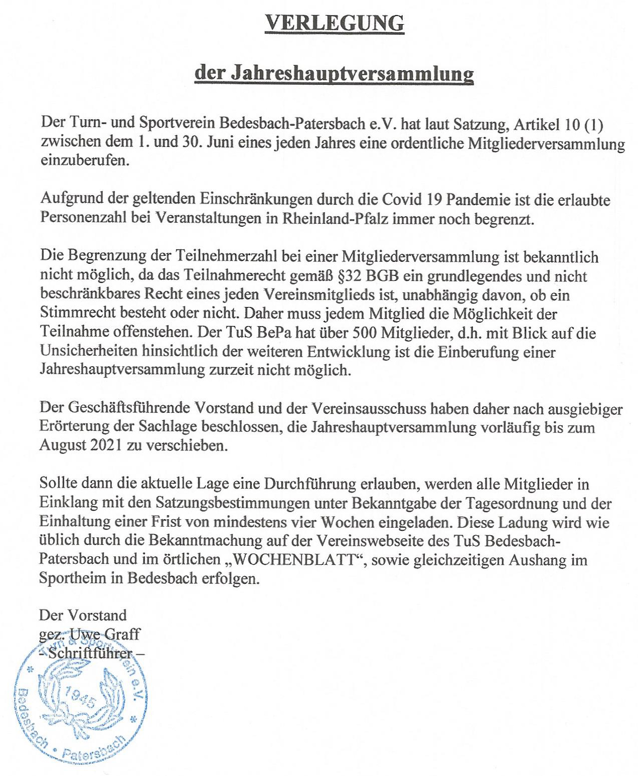 Die Jahreshauptversammlung 2021 mit Neuwahlen wird verschoben.
