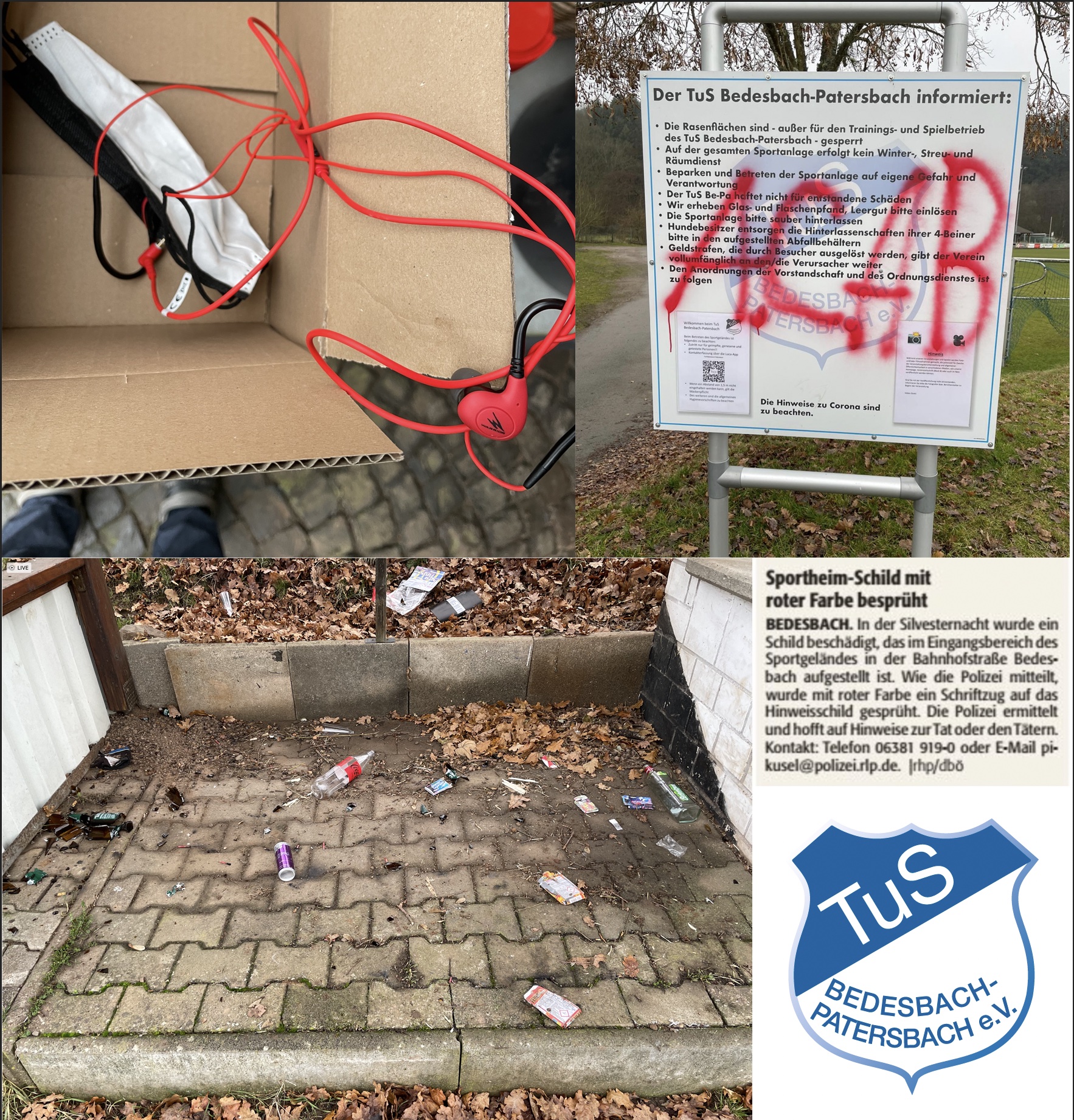Immer wieder kommt es rund um und direkt auf dem Sportgelände des TuS zu Sachbeschädigungen, Verunreinigungen und Abfallhinterlassenschaften. Die Schmierereien (Nationalsozialistische Symbole und die Beleidigung der Polizei) sind keine Kavaliersdelikte mehr und können strafrechtlich verfolgt werden. Durch zerstörte Glasflaschen - auch auf den öffentlichen Wegen - besteht Verletzungsgefahr. Diese Vorgänge werden vom TuS nicht mehr toleriert und wurden bei der Polizei zur Anzeige gebracht und der oder die Täter werden gesucht. Wer etwas gesehen hat oder sachdienliche Hinweise zu den Vorgängen machen kann, meldet sich bitte bei der Vorstandschaft des TuS oder der Polizei in Kusel.